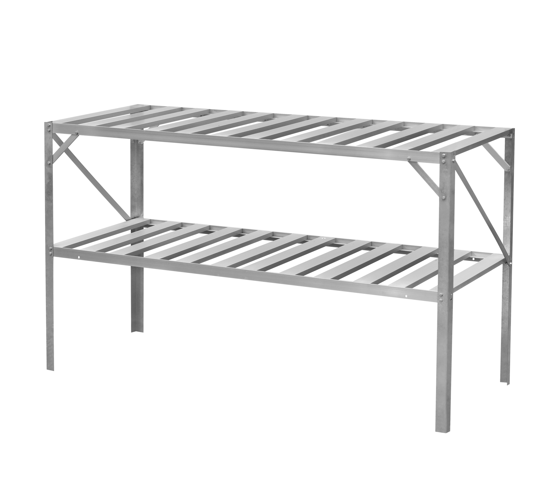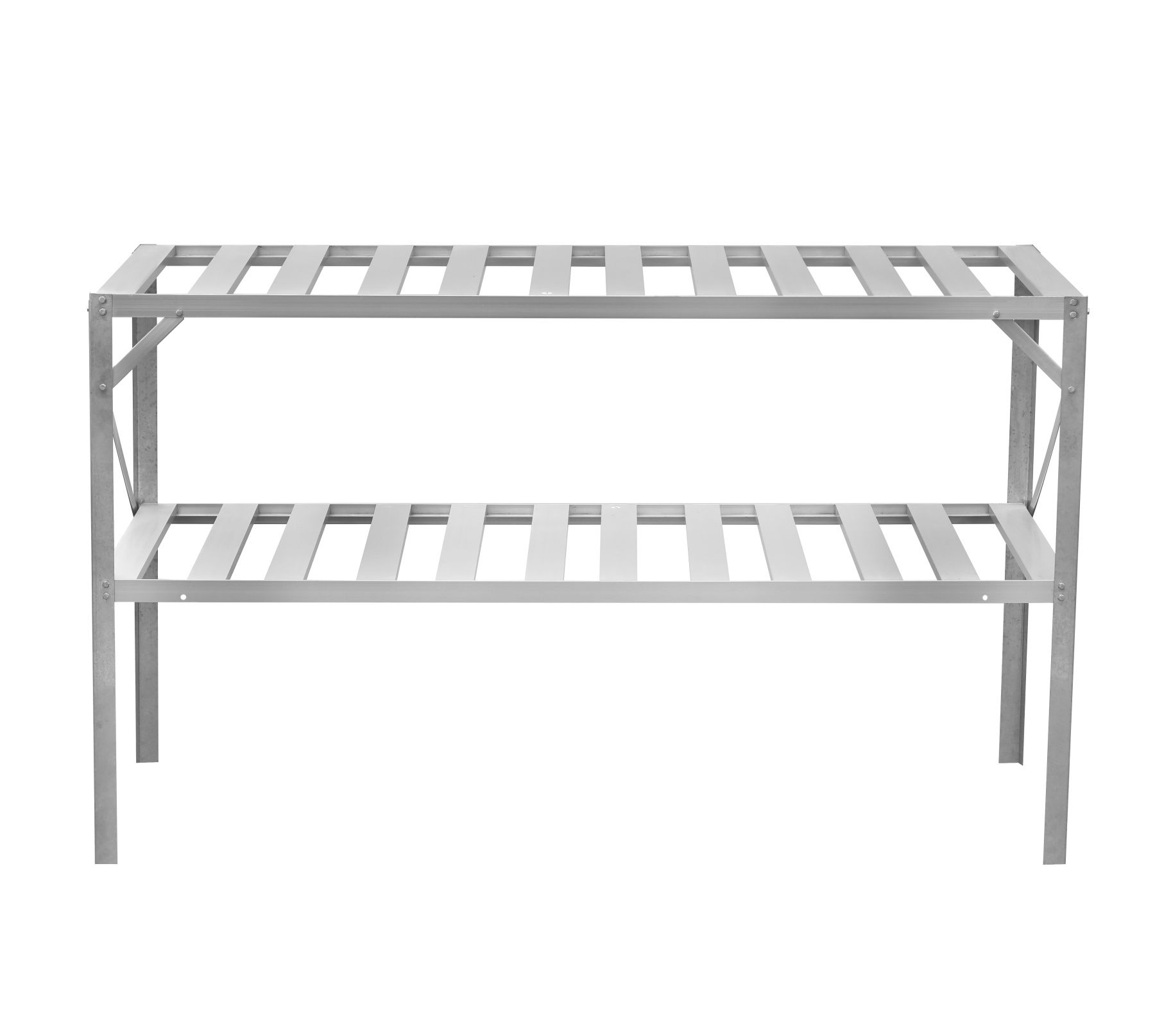 Celohliníkový dvoupolicový regál stojící na zemi. Rozměry regálu jsou d 130 x š 50 x v 74 cm. Vhodné pro skleníky všech typů. Univerzální produkt. Dodáváme v rozebraném stavu jako stavebnici.