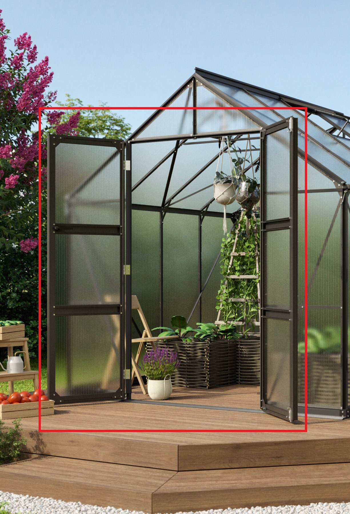 U skleníků VITAVIA SIRIUS a VITAVIA URANUS nabízíme možnost vyměnit stávající posuvné dveře za dveře na pantech. Dveřmi na pantech lze nahradit původní posuvné dveře (ty je nutné demontovat). Rám dveří je vyroben z eloxovaného hliníku v černé barvě, který zajišťuje vysokou odolnost a ochranu před přírodními vlivy pro dlouhodobé využití.