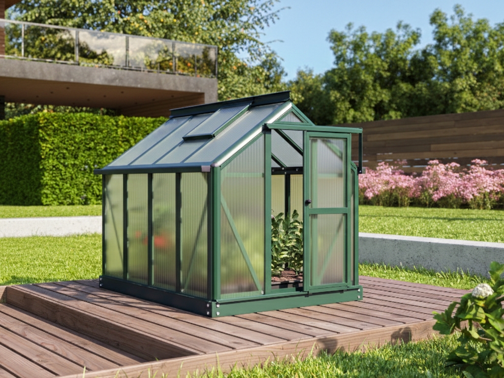 Hliníkový miniskleník na bylinky, š 0,87 x d 1,11 m x v 0,91 cm, zelená barva, 1x stř. okno, polykarbonát 4 mm, 2x dveře, základna v ceně, plocha 0,96 m2.