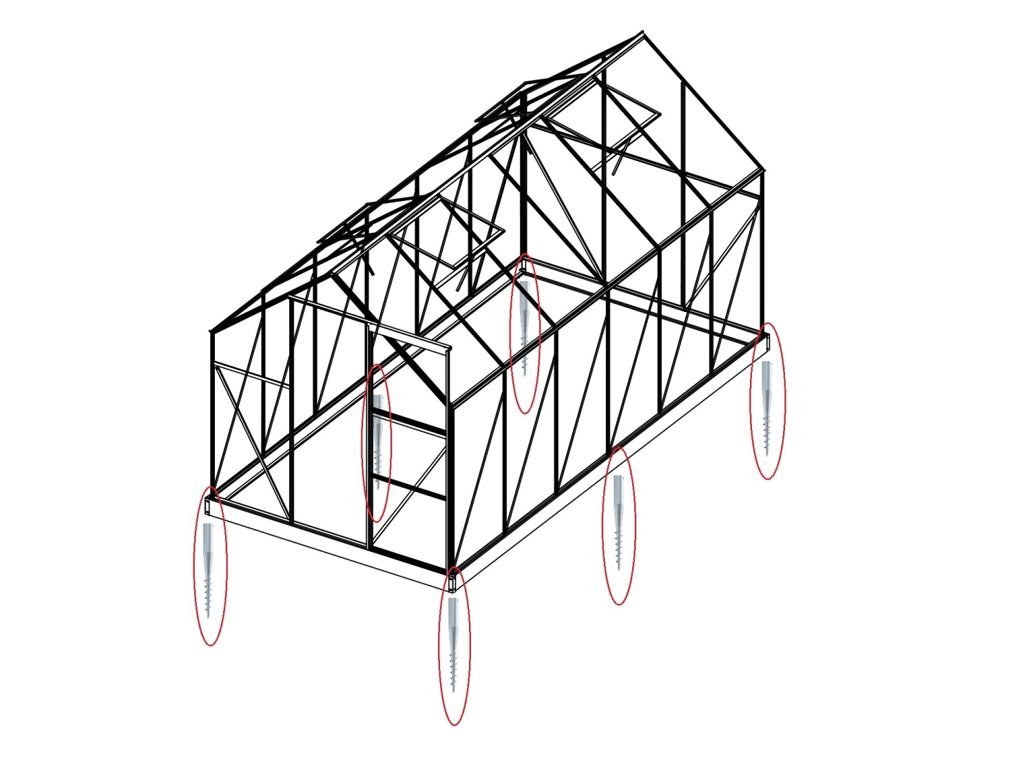 Kotvící sada není použitelná na obloukové skleníky a na skleníky bez základny. Není nutné stavět podezdívku, vruty upevní skleník přímo k zemi. Na šířku i na délku je maximální rozteč mezi sousedními vruty 200 cm.