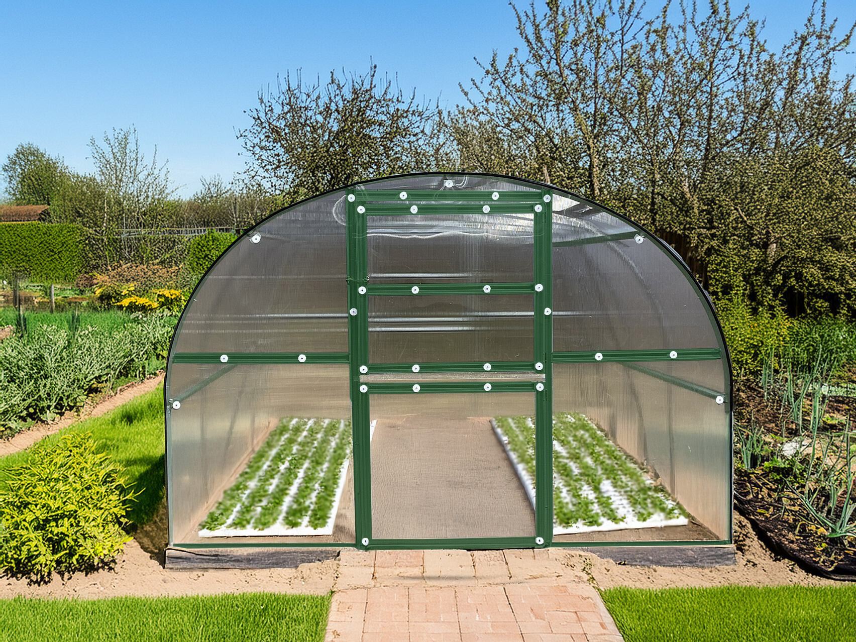 Obloukový ocelový skleník, š 3 x d 8 m, barva zelená, pozinkované profily, 1x střešní okno v ceně, polykarbonát 8 mm, plocha 24 m2.