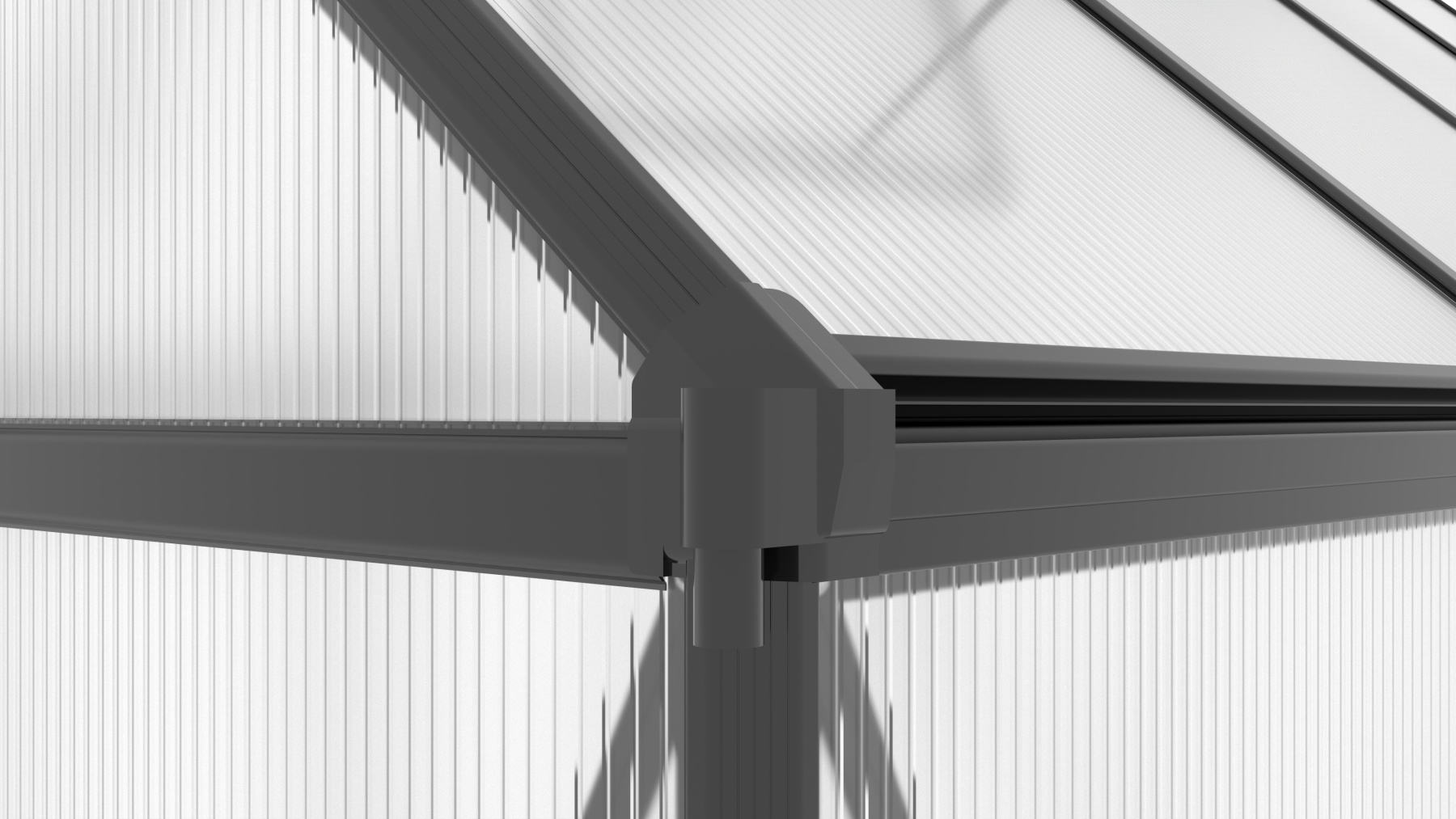 Skleníky řady SARANA jsou jedny z nejprodávanějších modelů značkových skleníků LANIT PLAST. Rámová konstrukce je vyrobena z eloxovaných hliníkových profilů, které zaručují dlouhou životnost a vysokou odolnost. Prosklení tvoří dvoustěnné komůrkové polykarbonátové desky o tloušťce 4 mm, které poskytují vynikající tepelně-izolační vlastnosti a optimální ochranu proti UV záření. Desky jsou pevně uchyceny do plochých i rohových H-profilů, čímž je zajištěna maximální stabilita a odolnost celé konstrukce. Skleník je dále vybaven uzavřenými bočními hranami polykarbonátu, které přispívají k jeho dlouhodobé trvanlivosti. Hlavní předností modelu jsou zesílené nosné profily, které výrazně zvyšují jeho pevnost a odolnost vůči povětrnostním podmínkám, jako je silný vítr a sněhové zatížení.