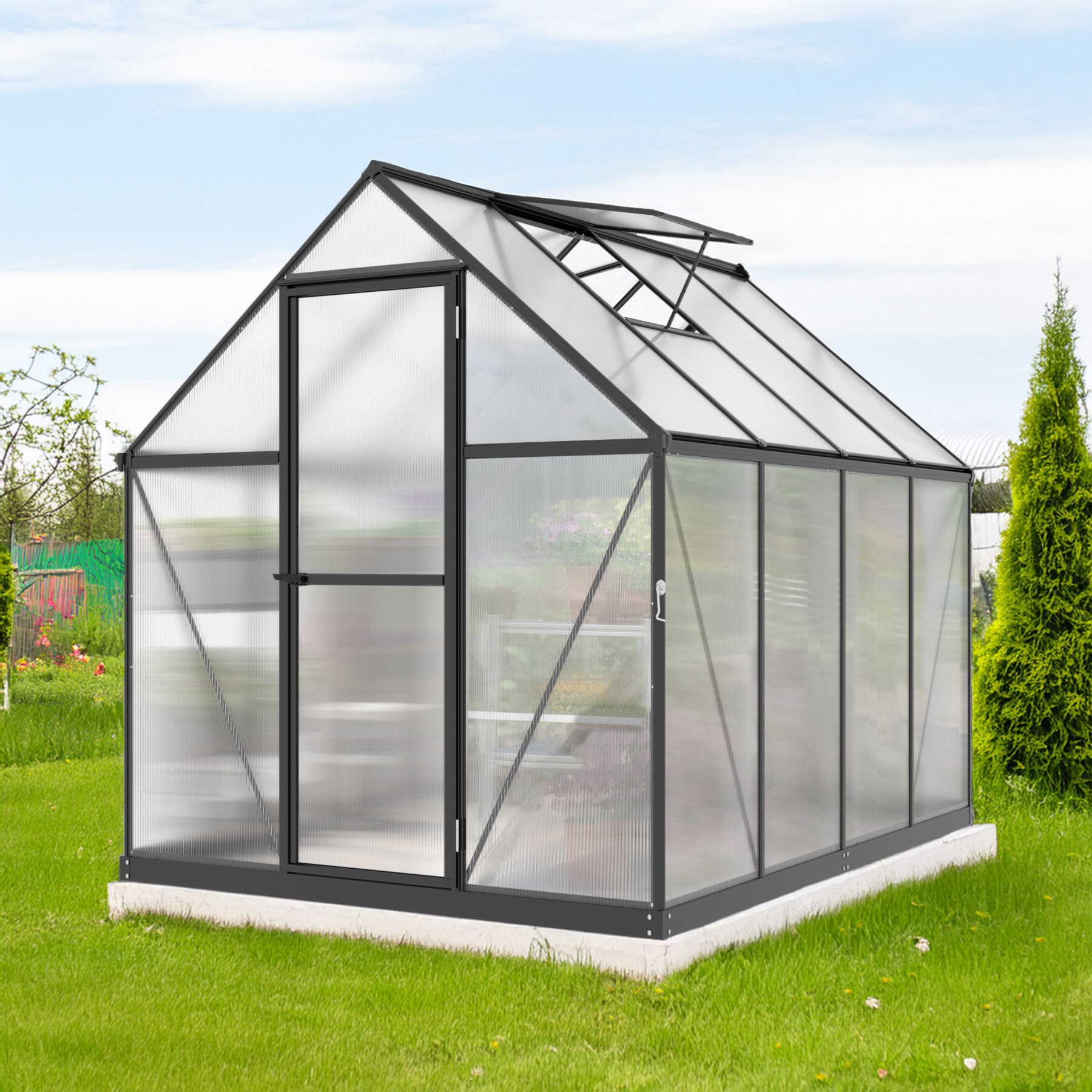 Hliníkový skleník, š 1,82 x d 2,43 m, černý, 2x stř. okno, polykarbonát 4 mm, dveře na pantech, základna v ceně, plocha 4,42 m2.