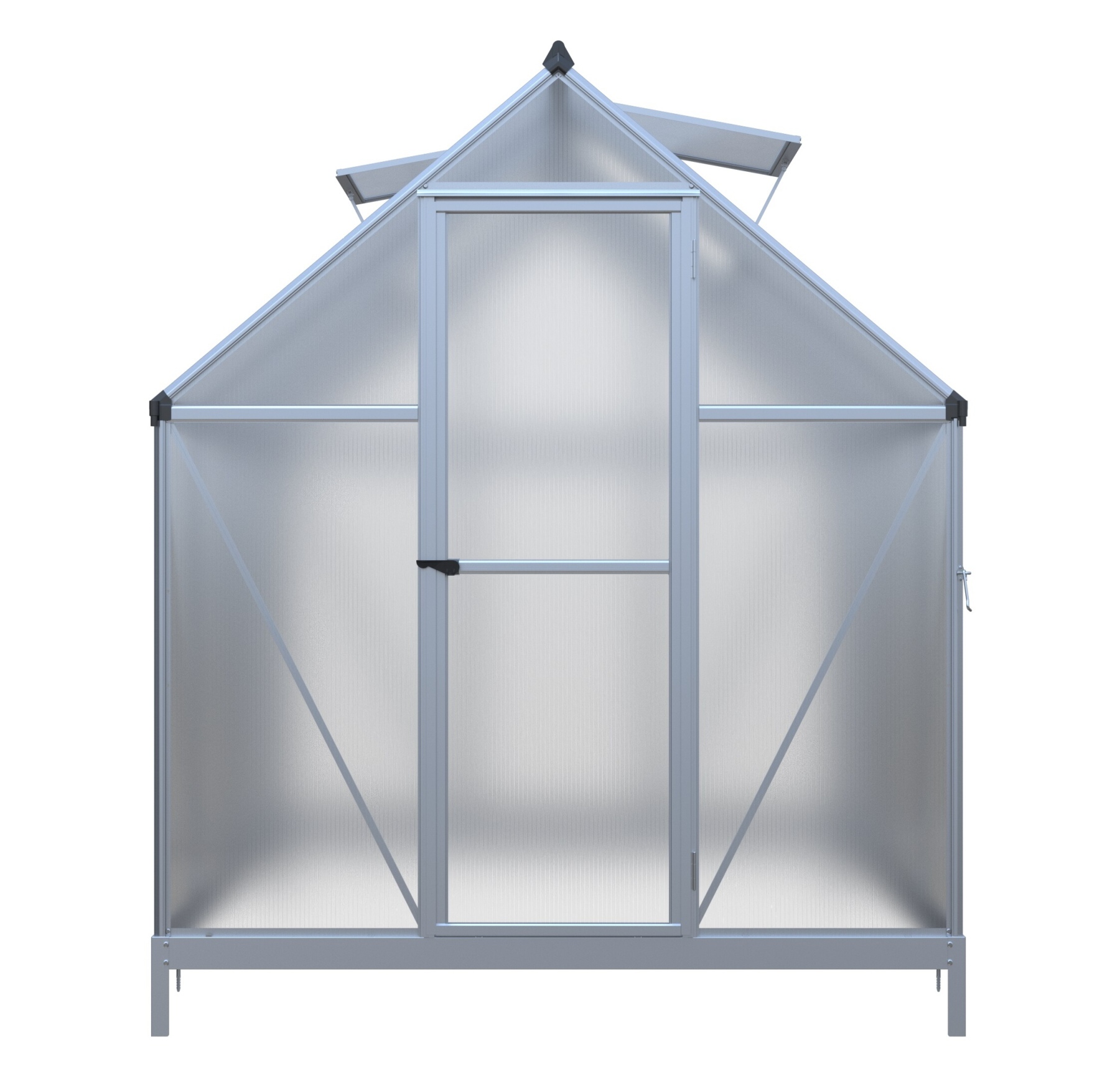 Hliníkový skleník, š 1,82 x d 2,43 m, stříbrný, 2x stř. okno, polykarbonát 4 mm, dveře na pantech, základna v ceně, plocha 4,42 m2.