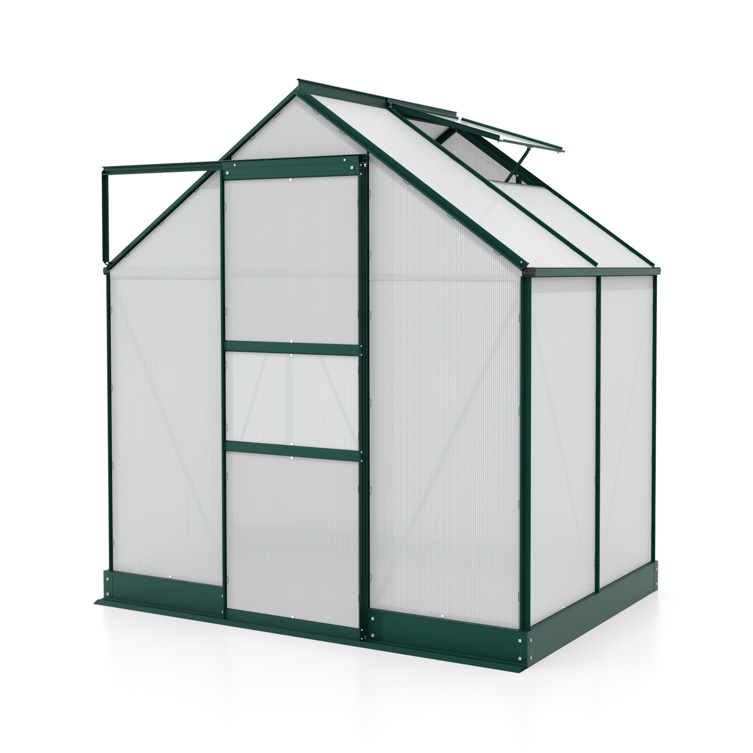 Obsahem balení jsou jednokřídlé posuvné dveře (š x v otvoru = 0,61 x 1,74 m), AL profily, prosklení, pozinkovaná ocelová základna, 1x střešní ventilační okénko s manuálním otevíráním, veškerý spojovací materiál. Ke skleníku je možné dokoupit řadu nadstandardního příslušenství - poličky, regály, další větrací střešní okno, automatický otvírač, okapové sady, teploměry, vlhkoměry, zavlažovací zařízení, elektrické odporové vytápění půdy.