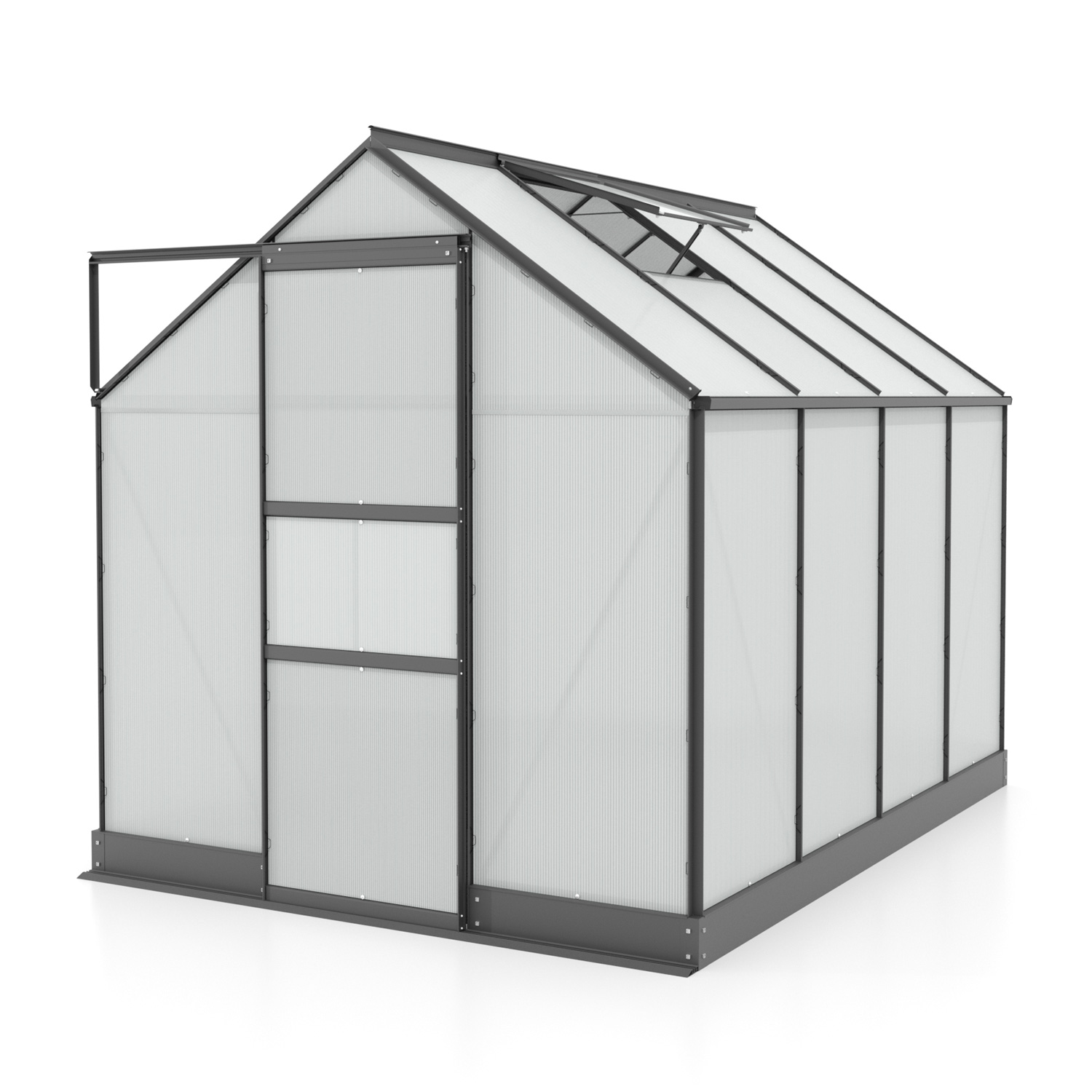 Obsahem balení jsou jednokřídlé posuvné dveře (š x v otvoru = 0,61 x 1,74 m), AL profily, prosklení, pozinkovaná ocelová základna, 1x střešní ventilační okénko s manuálním otevíráním, veškerý spojovací materiál. Ke skleníku je možné dokoupit řadu nadstandardního příslušenství - poličky, regály, další větrací střešní okno, automatický otvírač, okapové sady, teploměry, vlhkoměry, zavlažovací zařízení, elektrické odporové vytápění půdy.