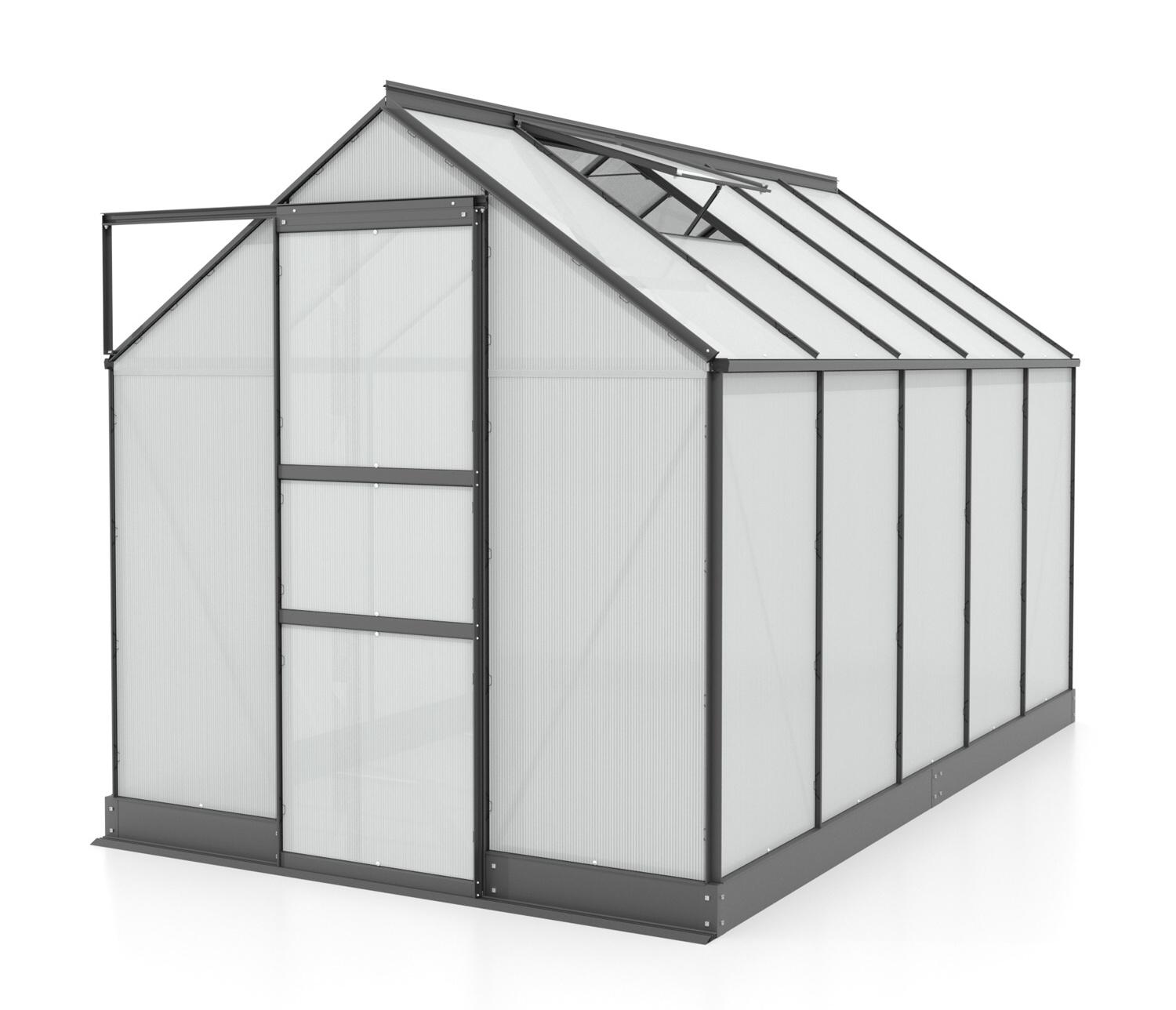 Obsahem balení jsou jednokřídlé posuvné dveře (š x v otvoru = 0,61 x 1,74 m), AL profily, prosklení, pozinkovaná ocelová základna, 2x střešní ventilační okénka s manuálním otevíráním, veškerý spojovací materiál. Ke skleníku je možné dokoupit řadu nadstandardního příslušenství - poličky, regály, další větrací střešní okno, automatický otvírač, okapové sady, teploměry, vlhkoměry, zavlažovací zařízení, elektrické odporové vytápění půdy.
