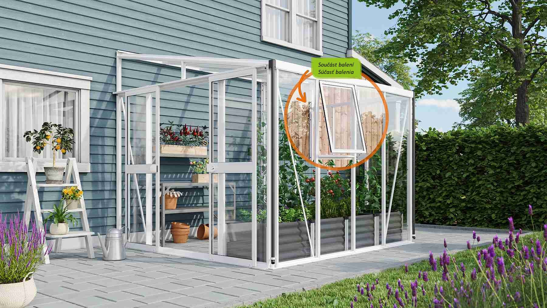Obsahem balení jsou dvoukřídlé posuvné dveře (š x v otvoru = 1,19 x 1,77 m), AL profily, prosklení, 1x boční ventilační okénko s manuálním otevíráním, 1x okapový žlab včetně dvou svodů, 1x cylindrický zámek a veškerý spojovací materiál. Ke skleníku je možné dokoupit řadu nadstandardního příslušenství - poličky, regály, další větrací střešní i boční okénka, automatické otvírače k těmto okénkům, teploměry, vlhkoměry, zavlažovací zařízení, elektrické odporové vytápění půdy. Baleno v papírovém kartonu. Prosklení je zabalené v nevratné dřevěné bedně.