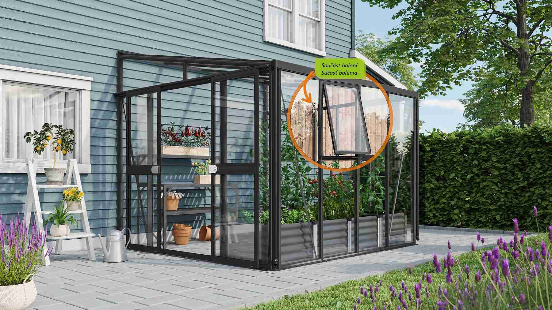 Obsahem balení jsou dvoukřídlé posuvné dveře (š x v otvoru = 1,19 x 1,77 m), AL profily, prosklení, 1x boční ventilační okénko s manuálním otevíráním, 1x okapový žlab včetně dvou svodů, 1x cylindrický zámek a veškerý spojovací materiál. Ke skleníku je možné dokoupit řadu nadstandardního příslušenství - poličky, regály, další větrací střešní i boční okénka, automatické otvírače k těmto okénkům, teploměry, vlhkoměry, zavlažovací zařízení, elektrické odporové vytápění půdy. Baleno v papírovém kartonu. Prosklení je zabalené v nevratné dřevěné bedně.