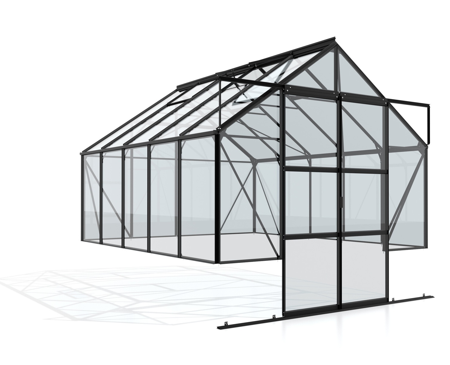 Obsahem balení jsou dvoukřídlé posuvné dveře (š x v otvoru = 1,22 x 1,94 m), AL profily, prosklení, 4x střešní ventilační okénko s manuálním otevíráním, veškerý spojovací materiál. Ke skleníku je možné dokoupit řadu nadstandardního příslušenství - poličky, regály, další větrací střešní i boční okénka, automatické otvírače k těmto okénkům, okapové sady, teploměry, vlhkoměry, zavlažovací zařízení, elektrické odporové vytápění půdy.