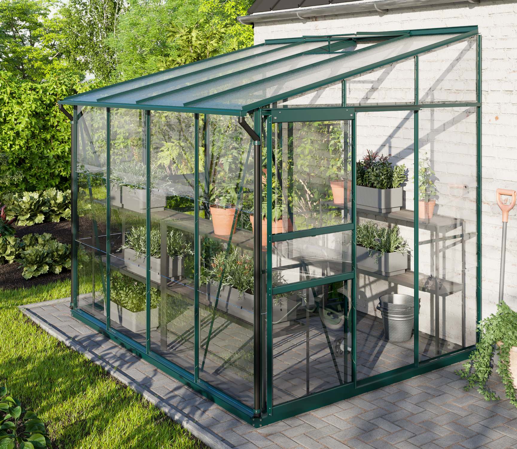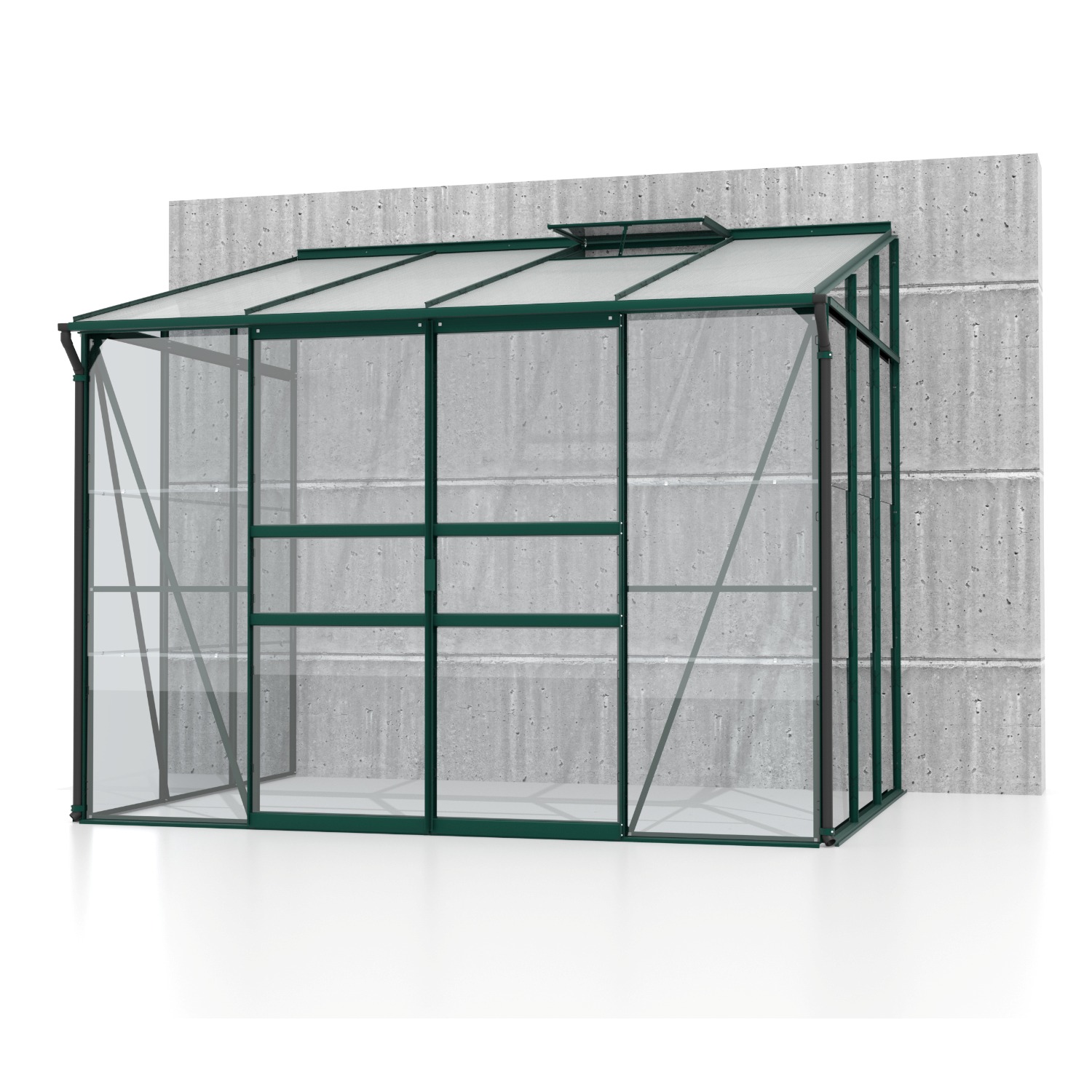 Hliníkový skleník ke stěně, š 2,62 x d 2,01 m, zelená barva, 1x stř. okno, kalené čiré sklo 3 mm + PC 6 mm, plocha 5,27 m2.