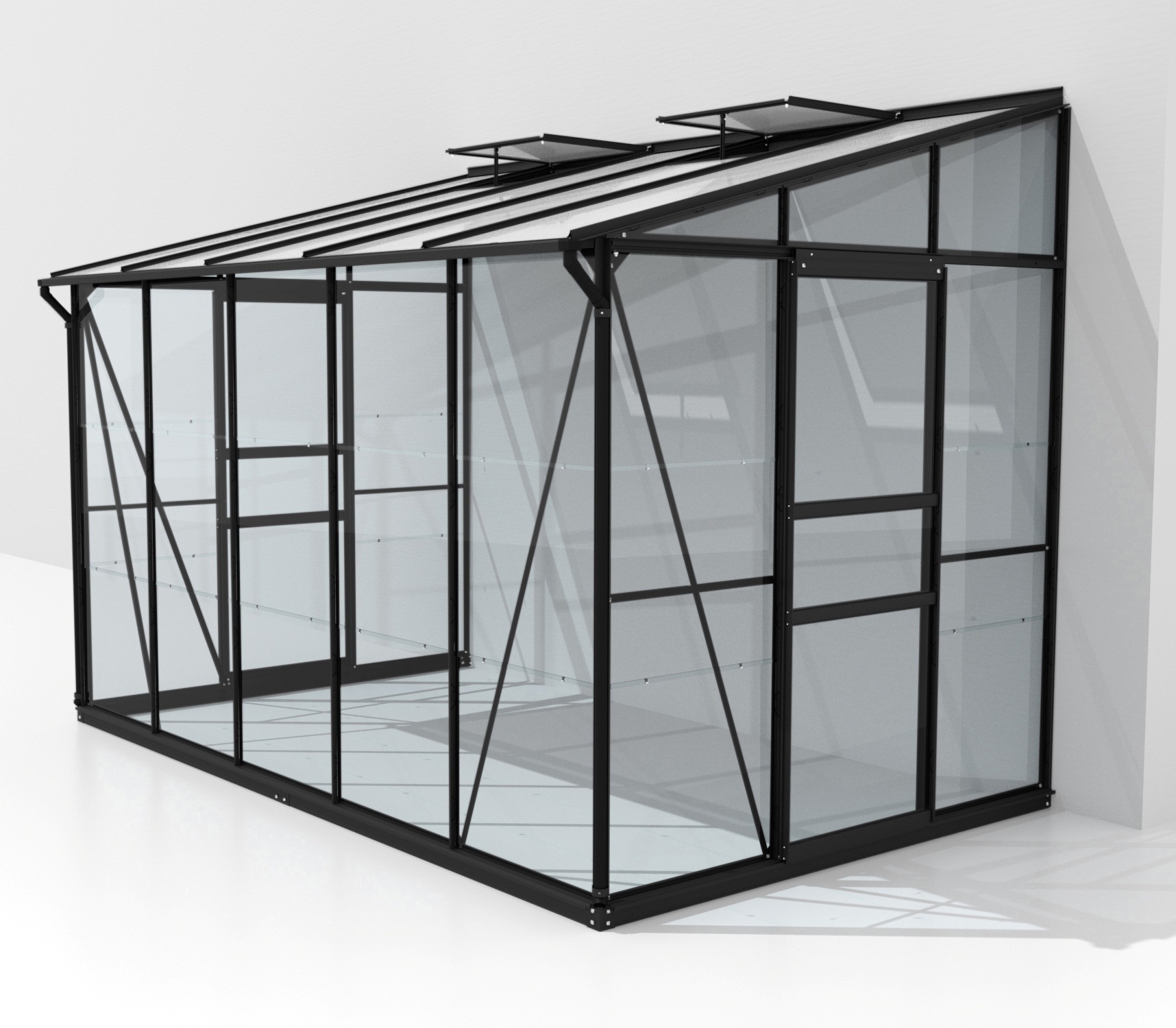 Skleník je určen k montáži ke zdi – zadní stěna není součástí konstrukce.