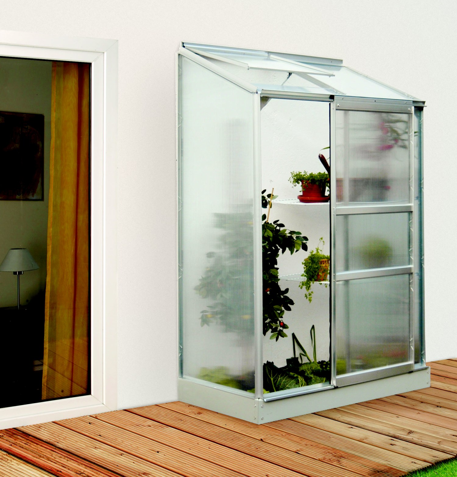 Skleník je určen k montáži ke zdi – zadní stěna není součástí konstrukce.