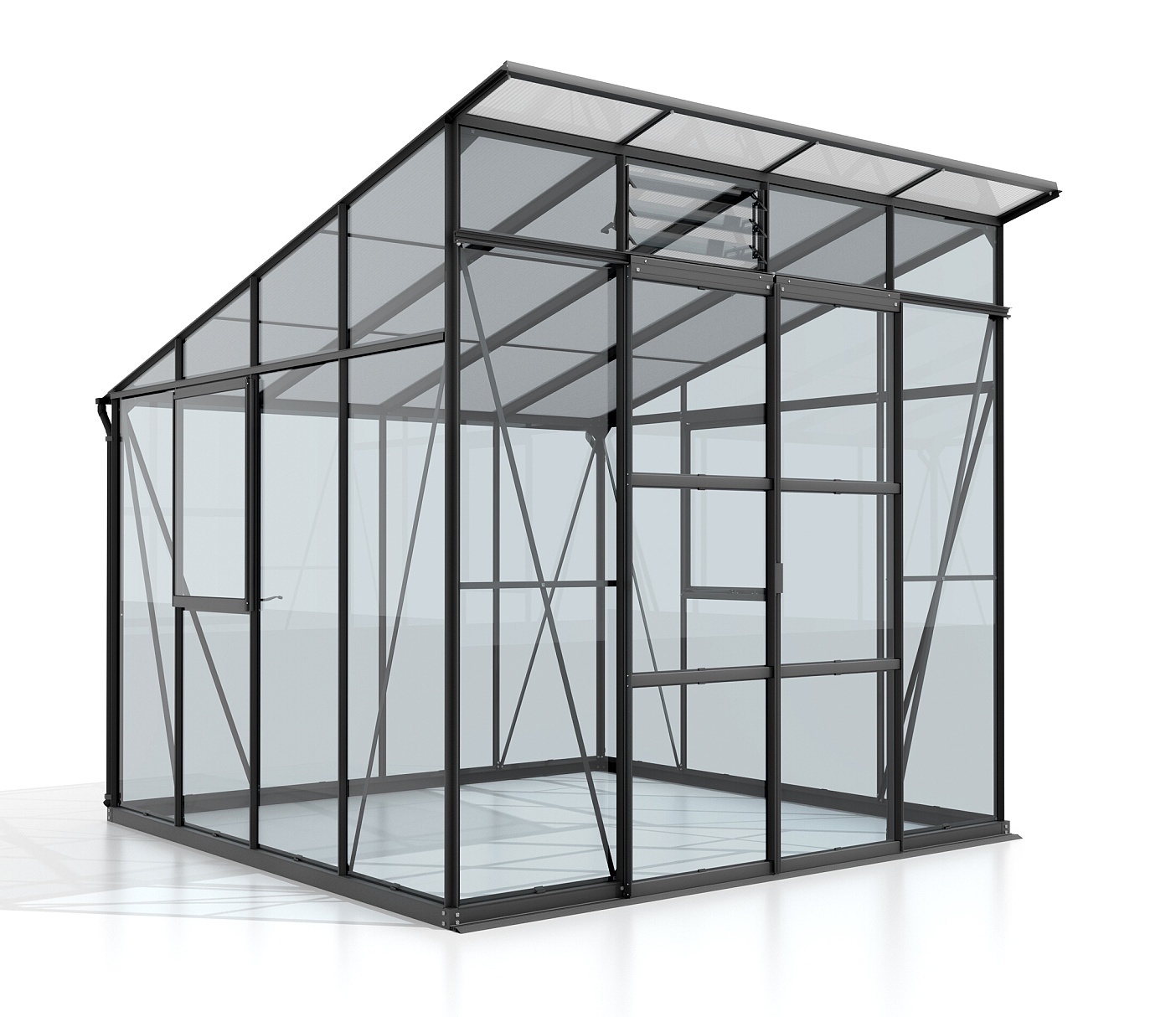 Hliníkový skleník, š 2,54 x d 2,54 m, černý, 2x boční + 1x žaluziové okno, kalené sklo 3 mm, posuvné dveře, plocha 6,45 m2.