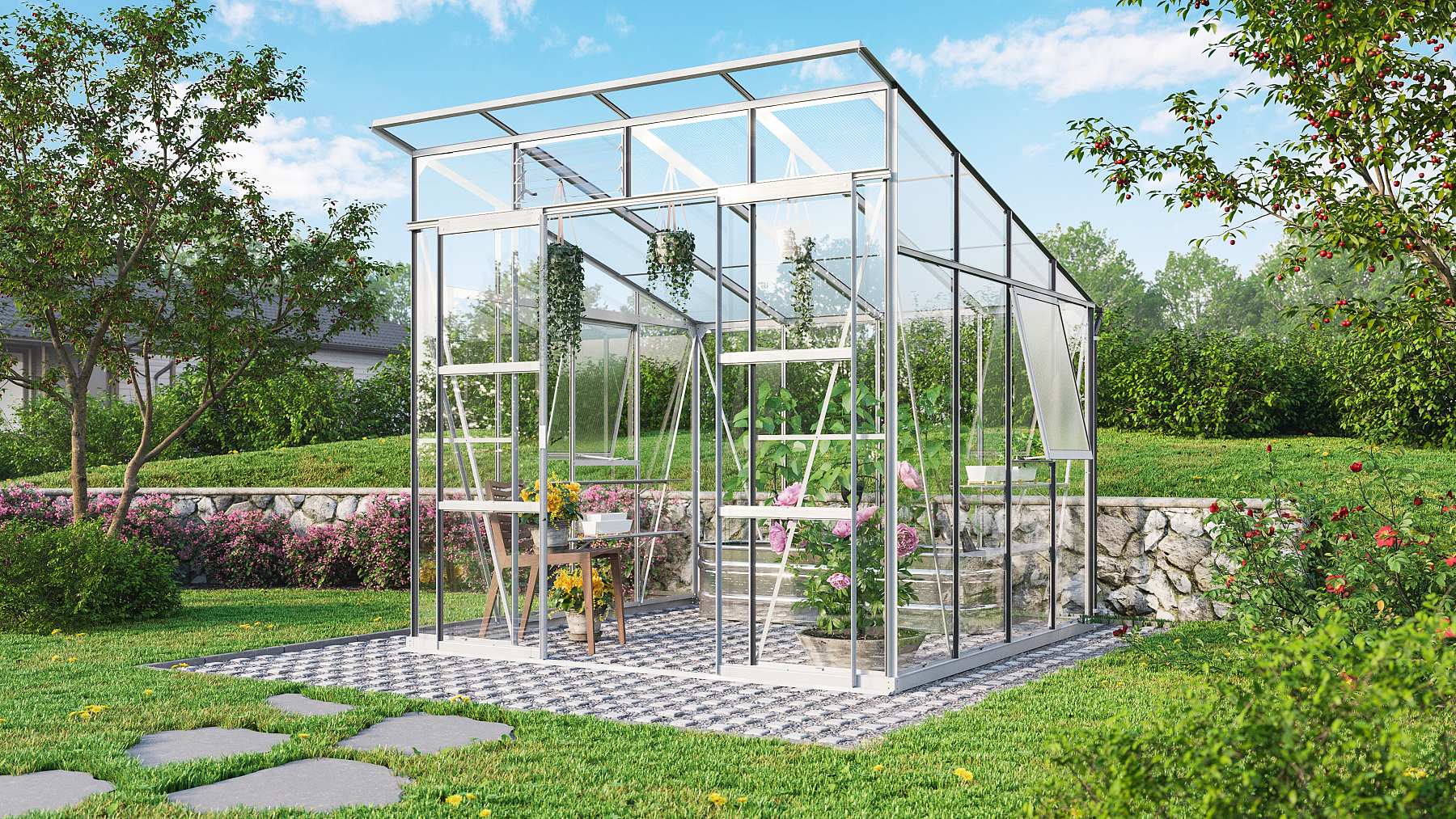 Velkou výhodou tohoto skleníku je extrémně nízký práh usnadňující používání, takže do skleníku lehce vjedete i se zahradním kolečkem.
