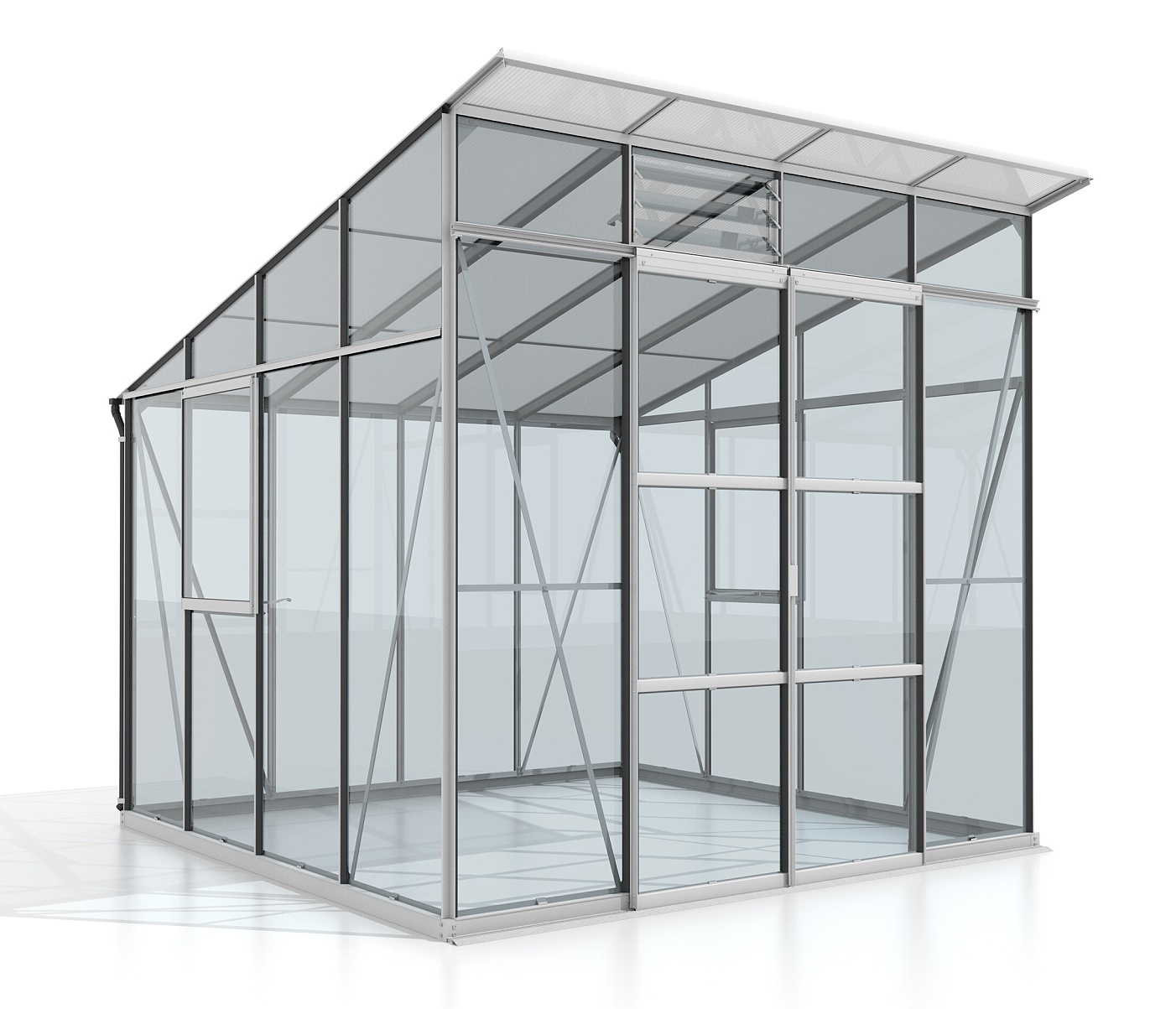 Hliníkový skleník, š 2,54 x d 2,54 m, stříbrný, 2x boční + 1x žaluziové okno, kalené sklo 3 mm, posuvné dveře, plocha 6,45 m2.