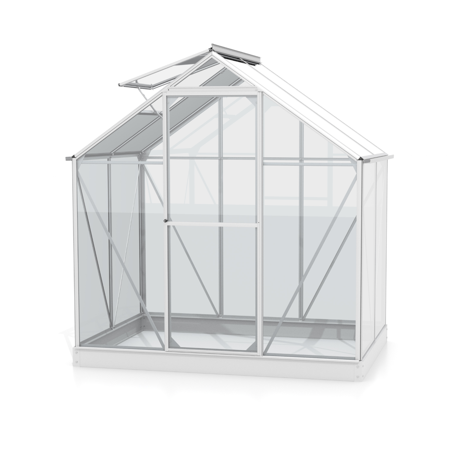Obsahem balení jsou jednokřídlé dveře na pantech (š x v otvoru = 0,61 x 1,64 m), AL profily, prosklení, pozinkovaná ocelová základna, 1x střešní ventilační okénko s manuálním otevíráním, veškerý spojovací materiál. Ke skleníku je možné dokoupit řadu nadstandardního příslušenství - poličky, regály, další větrací střešní i boční okénka, automatické otvírače k těmto okénkům, okapové sady, teploměry, vlhkoměry, zavlažovací zařízení, elektrické odporové vytápění půdy. Baleno v papírovém kartonu. Prosklení je zabalené v nevratné dřevěné bedně.
