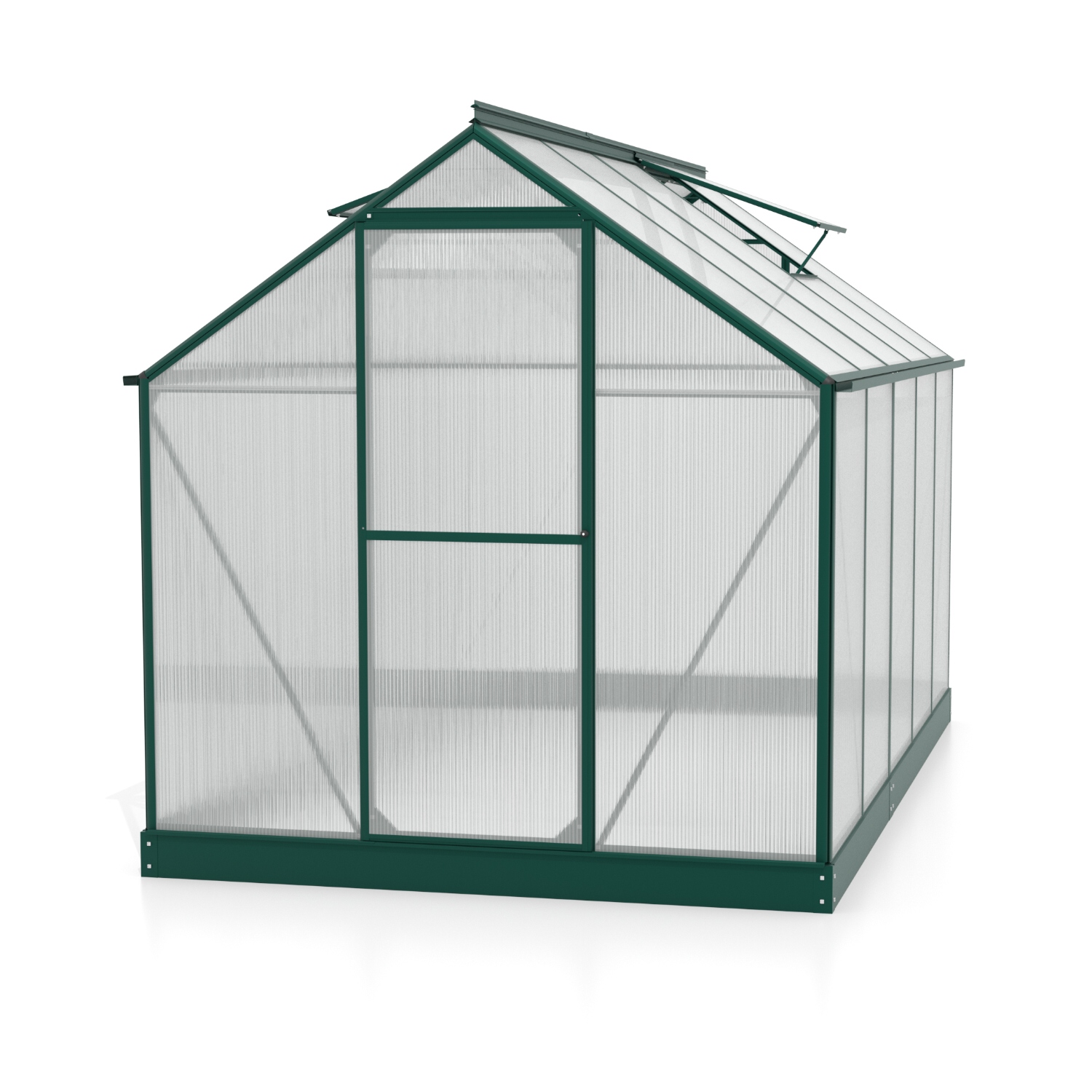 Obsahem balení jsou jednokřídlé dveře na pantech (š x v otvoru = 0,61 x 1,64 m), AL profily, prosklení, pozinkovaná ocelová základna, 2x střešní ventilační okénko s manuálním otevíráním, veškerý spojovací materiál. Ke skleníku je možné dokoupit řadu nadstandardního příslušenství - poličky, regály, další větrací střešní i boční okénka, automatické otvírače k těmto okénkům, okapové sady, teploměry, vlhkoměry, zavlažovací zařízení, elektrické odporové vytápění půdy.