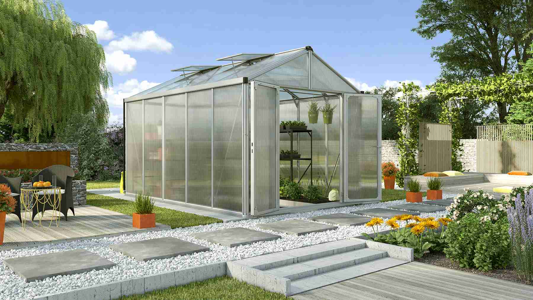 Velké a široké skleníky řady ZEUS COMFORT jsou zařazeny do kategorie PREMIUM - skleník je vyrobený značkovým výrobcem z Velké Británie. Skleník je vyrobený z masivních eloxovaných hliníkových profilů. Prosklení je z tepelně-izolačních komůrkových polykarbonátových desek síly 10 mm. Prosklení je ukotveno do konstrukce pomocí přítlačných hliníkových lišt (boční stěny) nebo je zasunuto do nosných profilů (střecha).
