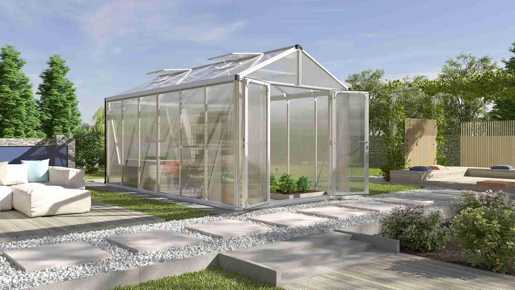 Velké a široké skleníky řady ZEUS COMFORT jsou zařazeny do kategorie PREMIUM - skleník je vyrobený značkovým výrobcem z Velké Británie. Skleník je vyrobený z masivních eloxovaných hliníkových profilů. Prosklení je z tepelně-izolačních komůrkových polykarbonátových desek síly 10 mm. Prosklení je ukotveno do konstrukce pomocí přítlačných hliníkových lišt (boční stěny) nebo je zasunuto do nosných profilů (střecha).