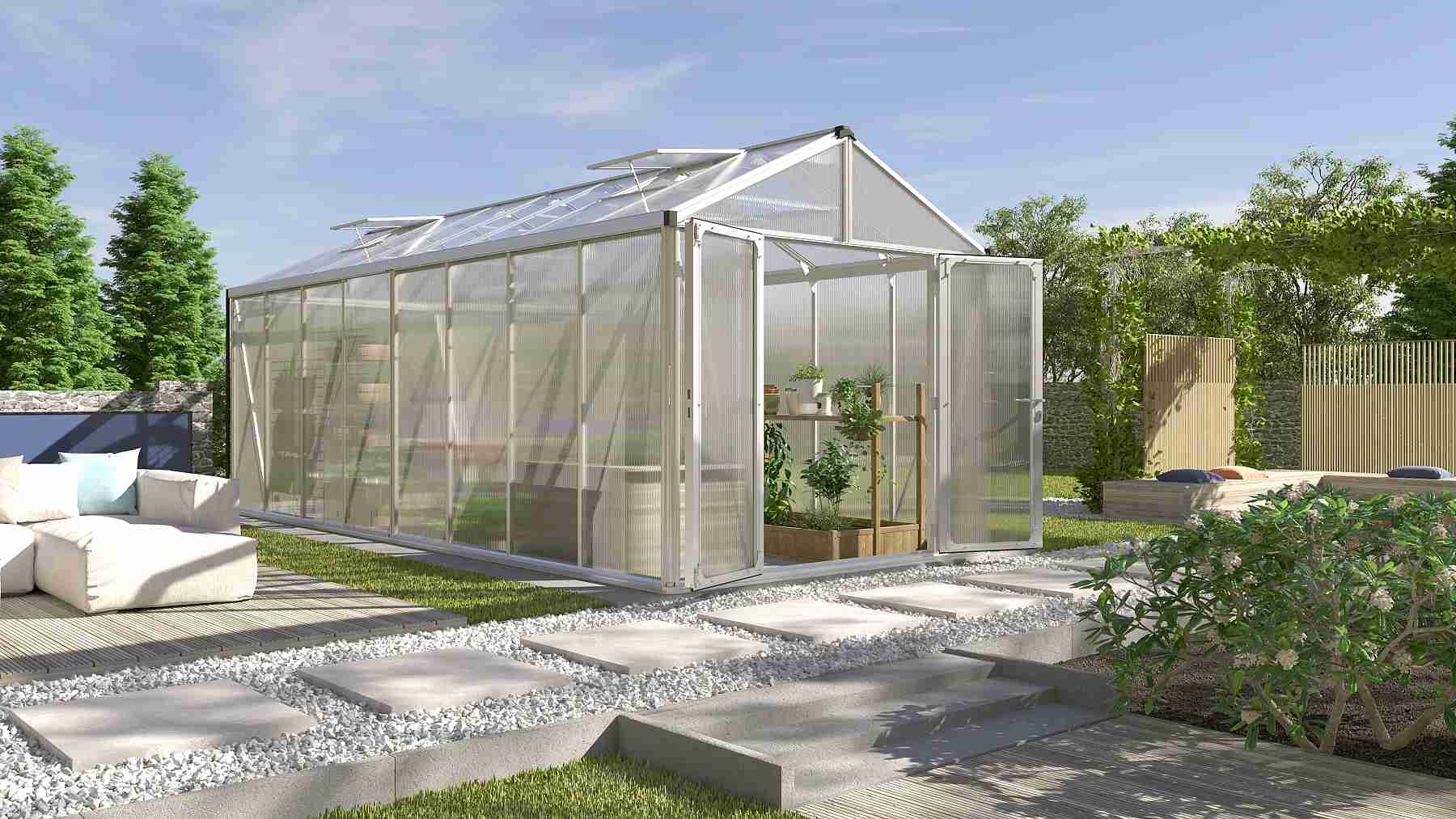 Velké a široké skleníky řady ZEUS COMFORT jsou zařazeny do kategorie PREMIUM - skleník je vyrobený značkovým výrobcem z Velké Británie. Skleník je vyrobený z masivních eloxovaných hliníkových profilů. Prosklení je z tepelně-izolačních komůrkových polykarbonátových desek síly 10 mm. Prosklení je ukotveno do konstrukce pomocí přítlačných hliníkových lišt (boční stěny) nebo je zasunuto do nosných profilů (střecha).