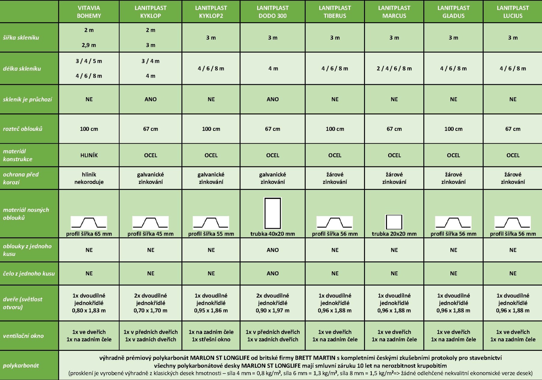 šířka 2,9 m, délky cca 4 / 6 / 8 m, masivní 1 mm silný a 65 mm široký eloxovaný hliníkový profil, rozteč oblouků 100 cm, vnitřní podpěry obloukové konstrukce, dvojité dveře vpředu, ventilační okno vzadu, prosklení nutno vyřezat z dodaných polykarbonátových desek |