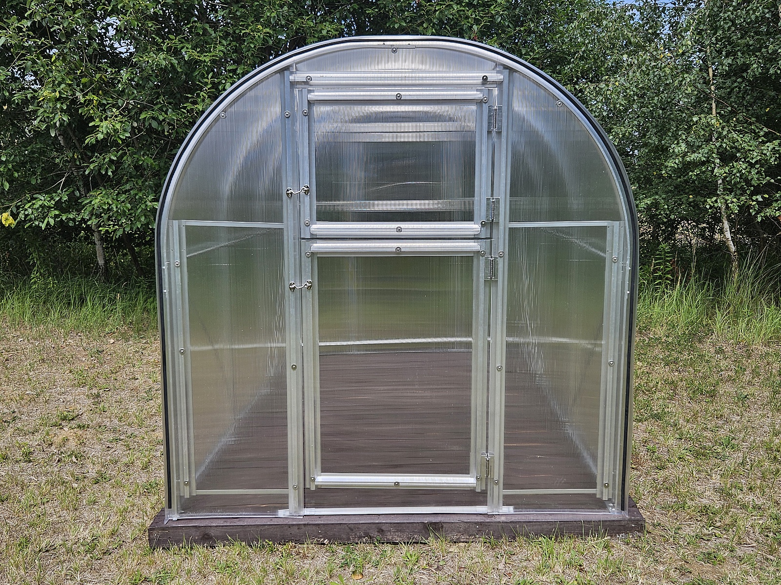 šířka 2,9 m, cca délky 4 / 6 / 8 m, masivní 1 mm silný a 65 mm široký eloxovaný hliníkový profil, rozteč oblouků 100 cm, vnitřní podpěry obloukové konstrukce, dvojité dveře vpředu, ventilační okno vzadu, prosklení nutno vyřezat z dodaných polykarbonátových desek |