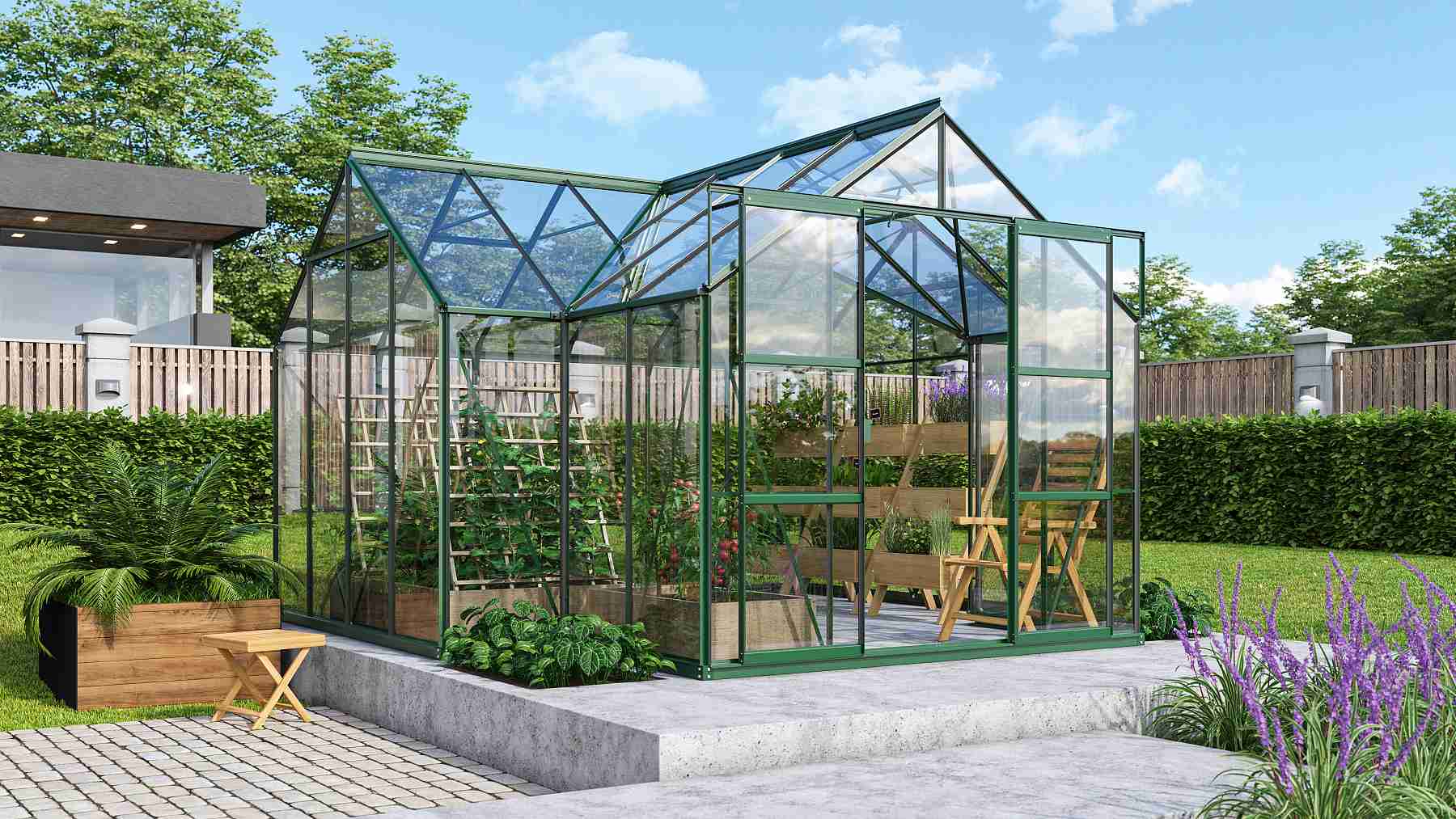 Obsahem balení jsou dvoukřídlé posuvné dveře (š x v otvoru = 1,22 x 1,91 m), plechová základna, AL profily, prosklení, 4x střešní ventilační okénko s manuálním otevíráním, 3 okapové svody, veškerý spojovací materiál. Skleník lze postavit buď na zděnou (betonovou, jinou) podezdívku nebo na základnu z pozinkovaného plechu (je obsahem dodávky). Ke skleníku je možné dokoupit řadu nadstandardního příslušenství - poličky, regály, další větrací střešní i boční okénka, automatické otvírače k těmto okénkům, okapové sady, teploměry, vlhkoměry, zavlažovací zařízení, elektrické odporové vytápění půdy.