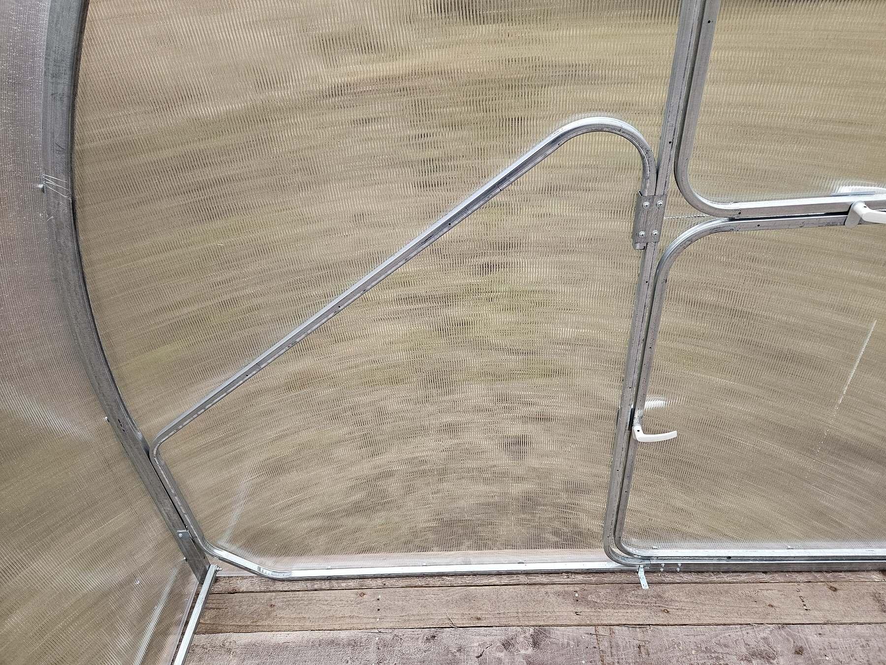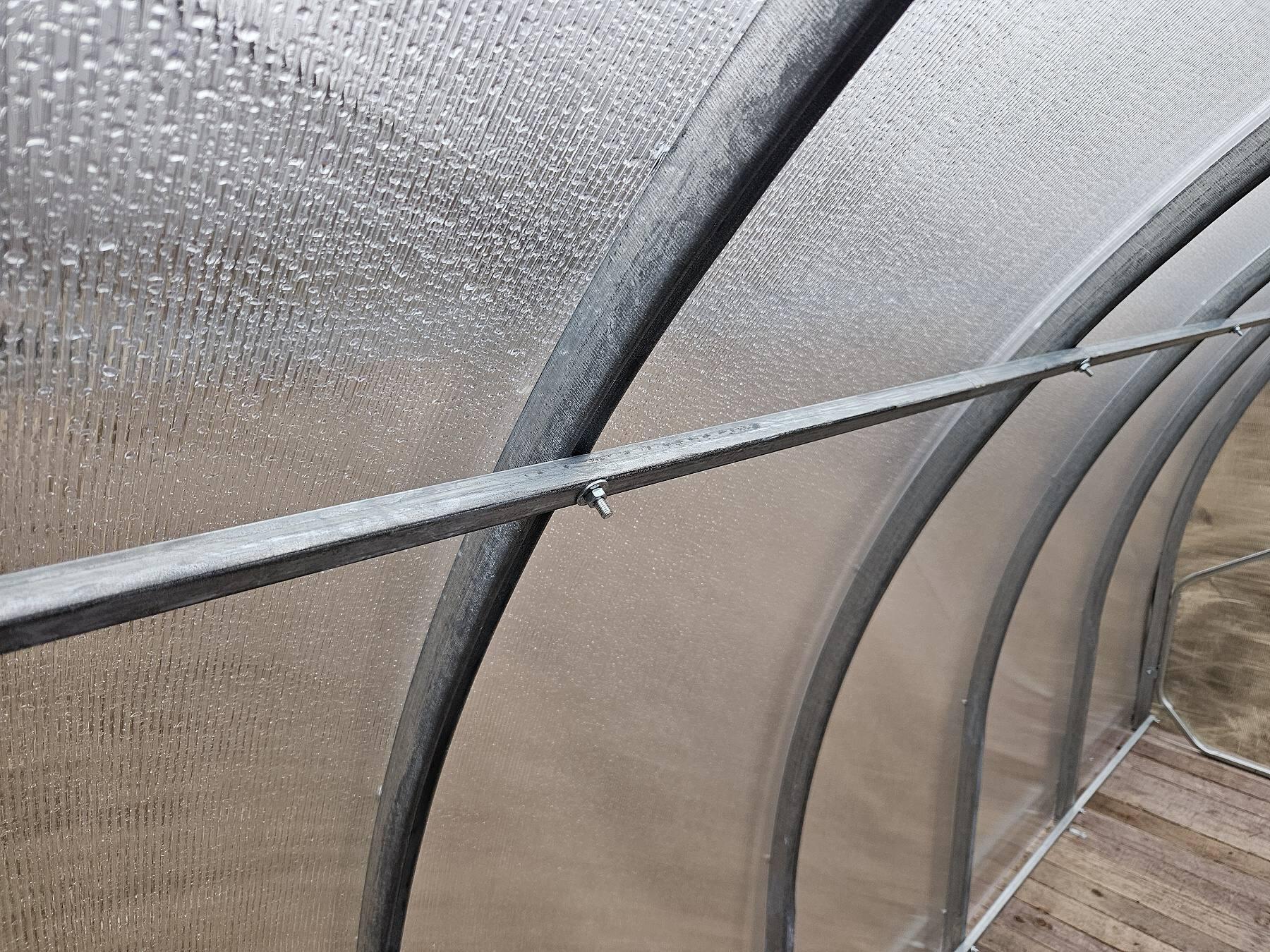 Konstrukce - konstrukce skleníku je z masivních obloukových trubek 40 x 20 mm (podélníky a vzpěry 20 x 20 mm). Materiál profilů je galvanicky pozinkovaný = na povrchu je vytvořená silná vrstva ochranného nekorodujícího zinku. Jednotlivá žebra nosných oblouků jsou od sebe vzdálena pouhých 67 cm, což je velká výhoda tohoto modelu skleníku oproti jiným výrobkům na českém trhu. Malá rozteč oblouků, profil 40 x 20 mm a fakt, že jsou vyrobeny z jednoho kusu oceli garantuje extrémní únosnost celé konstrukce skleníku. Přední a zadní čela skleníku jsou z výroby sešroubované a tvoří jednolitý celek. Přední i zadní čelo mají jednokřídlé dělené dveře na pantech (horní a spodní díl, kdy horní díl funguje jako samostatné okénko). Skleník je tedy PRŮCHOZÍ. Jako příplatkové příslušenství lze dokoupit automatický otvírač. olykarbonát dvoustěnný polykarbonát 6 mm se silným UV filtrem vyrobený v EU (proto na slunci nežloutne a nekřehne). Smluvní prodloužená záruka 5 let na nerozbitnost polykarbonátu krupobitím.