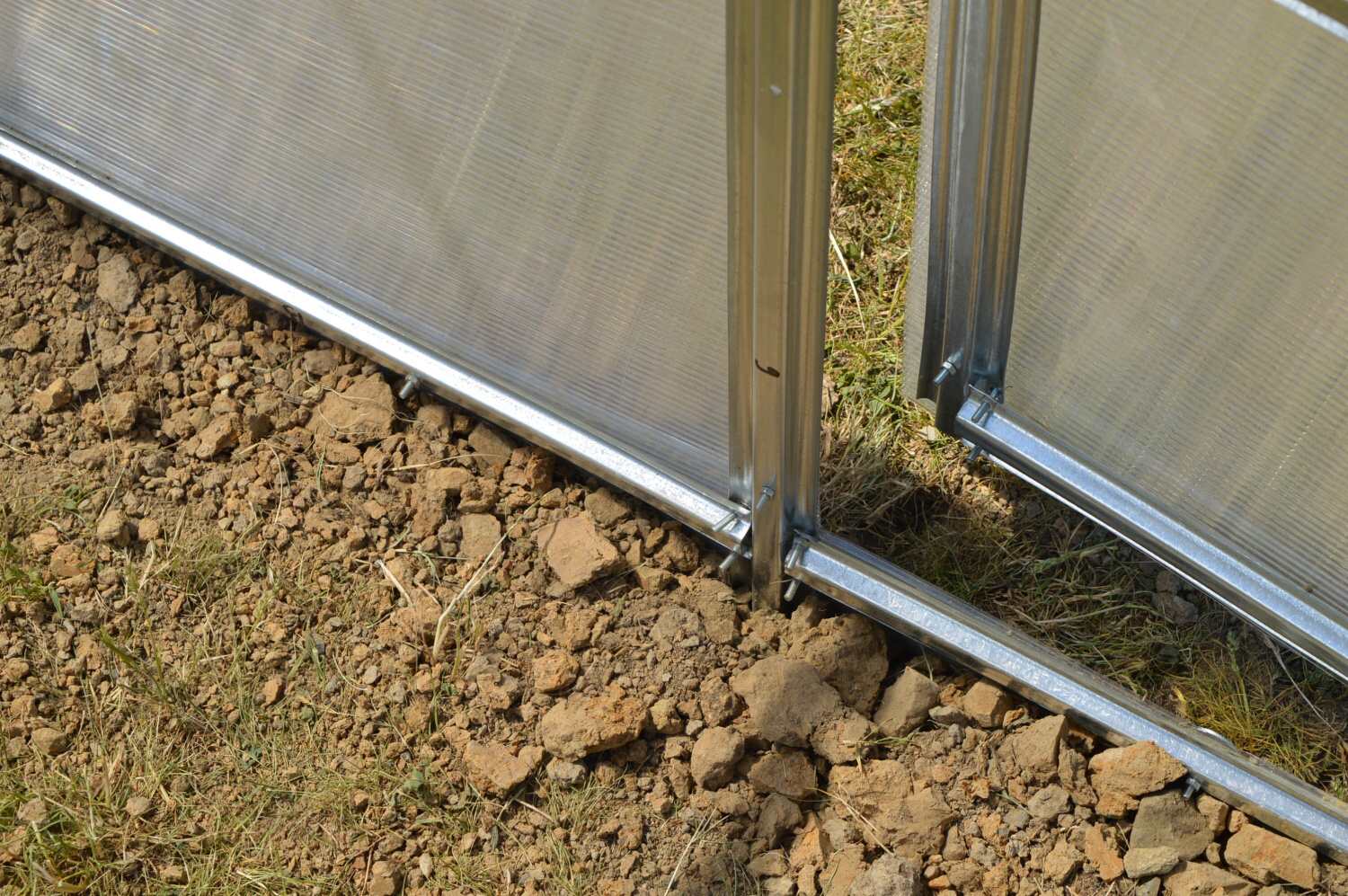 Skleník nepotřebuje žádnou podezdívku, protože konstrukce skleníku je připravena na zapuštění do země do hloubky cca 20 - 25 cm. Do děr v zemi se zasunou kotevní profily ve tvaru obráceného velkého písmene T, které se zabetonují. Skleník lze ukotvit i na dřevěnou / zděnou / betonovou podezdívku, vyžaduje to však drobné kutilské zásahy a především domácí vyrobení atypických plechových L úchytek pro přišroubování profilů k podezdívce (výrobce ukotvení skleníku na podezdívku nepředpokládá).