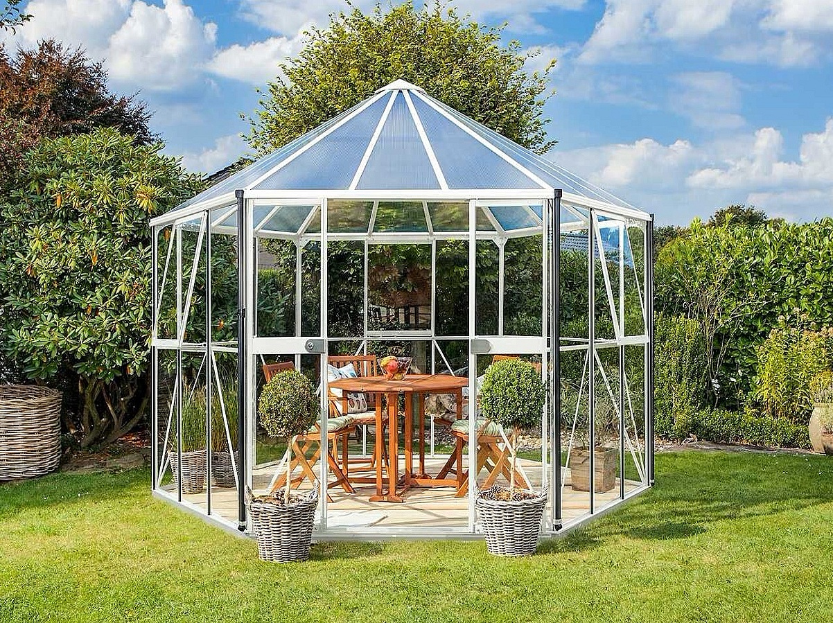 Pavilon HERA 9000 je zařazený do kategorie PREMIUM - pavilon je vyrobený značkovým výrobcem z Velké Británie. Pavilon je vyrobený z eloxovaných hliníkových profilů. Prosklení stěn je z kaleného čirého skla síly 3 mm (stěny) a z nerozbitného komůrkového polykarbonátu 6 mm (střecha). Čiré sklo zajišťuje výbornou světelnou propustnost, takže do povilonu je krásně vidět ze všech stran a můžete se kochat pohledem na pěstovanou zeleninu nebo květiny. Prosklení střechy je z vysoce kvalitního dvoustěnného polykarbonáty s UV filtrem (nekřehne, nežloutne) od evropského výrobce. Polykarbonát i sklo jsou do hliníkových profilů uchycené pomocí ocelových sponek. Součástí pavilonu je i pozinkovaná ocelová základna o výšce 6 cm. Na nerozbitnost polykarbonátu krupobitím poskytujeme prodlouženou záruku v délce 10 let.